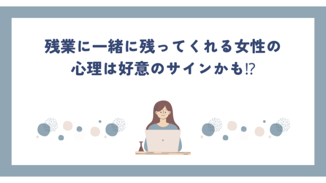 恋愛 残業に一緒に残ってくれる女性の心理「好意のサインや行動パターンは⁉」 pa-tya 「仕事が終わらない時、彼女が最後まで一緒に残ってくれた」。そんな経験があると、「ただの親切?」それとも「好意のサイン?」と、相手の気持ちが …