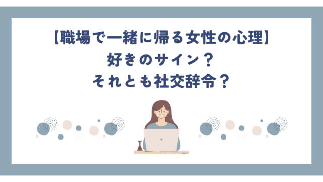 恋愛 【職場で一緒に帰る女性の心理】好きのサイン?それとも社交辞令? pa-tya 職場で一緒に帰ってくれる女性の行動は、「好意の表れかも?」と期待する一方で、「単なる社交辞令かも?」と悩むことも多いですよね。一緒に帰ろう …