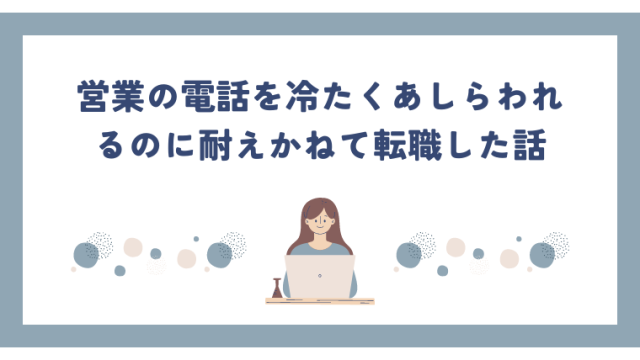 仕事の悩み 営業の電話を冷たくあしらわれるのに耐えかねて転職した話 pa-tya 営業の電話をするのが苦痛です。毎回冷たくあしらわれるのが本当に嫌だと思っているのです。このまま転職した方がよいのかなっていつも考えている …